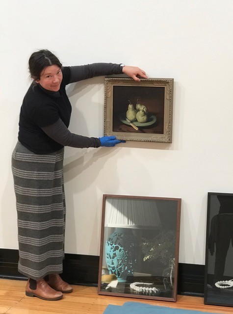 CAM intern Emily Donehue installing Harley C Griffiths (1908–81), Pears 1939, in the Higgins Gallery. Image: Janina Green.